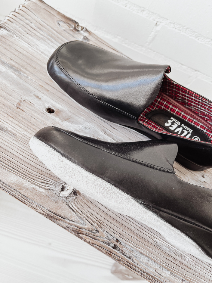 Ilveksen umpikantainen aamutossu on laadukas jalkine. Päällinen on mustaa pintanahkaa, sisältä kangasvuori. Ulkopohja on myös nahkaa. Tämä aamutossu on mukava ja kevyt kenkä. Helppo sujauttaa jalkaan. Tämä on extra leveällä lestillä.