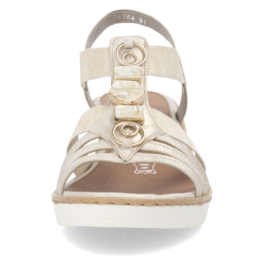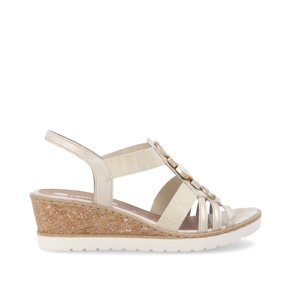 Rieker-Remonte – naisten kiilakorkosandaalit ovat sirot ja tyylikkäät kengät kesäisiin menoihin. Venykkeissä ja kannassa on hieman glitterkimalletta ja päällä koristekuvioita. Kannan korkeus n. 5 cm.