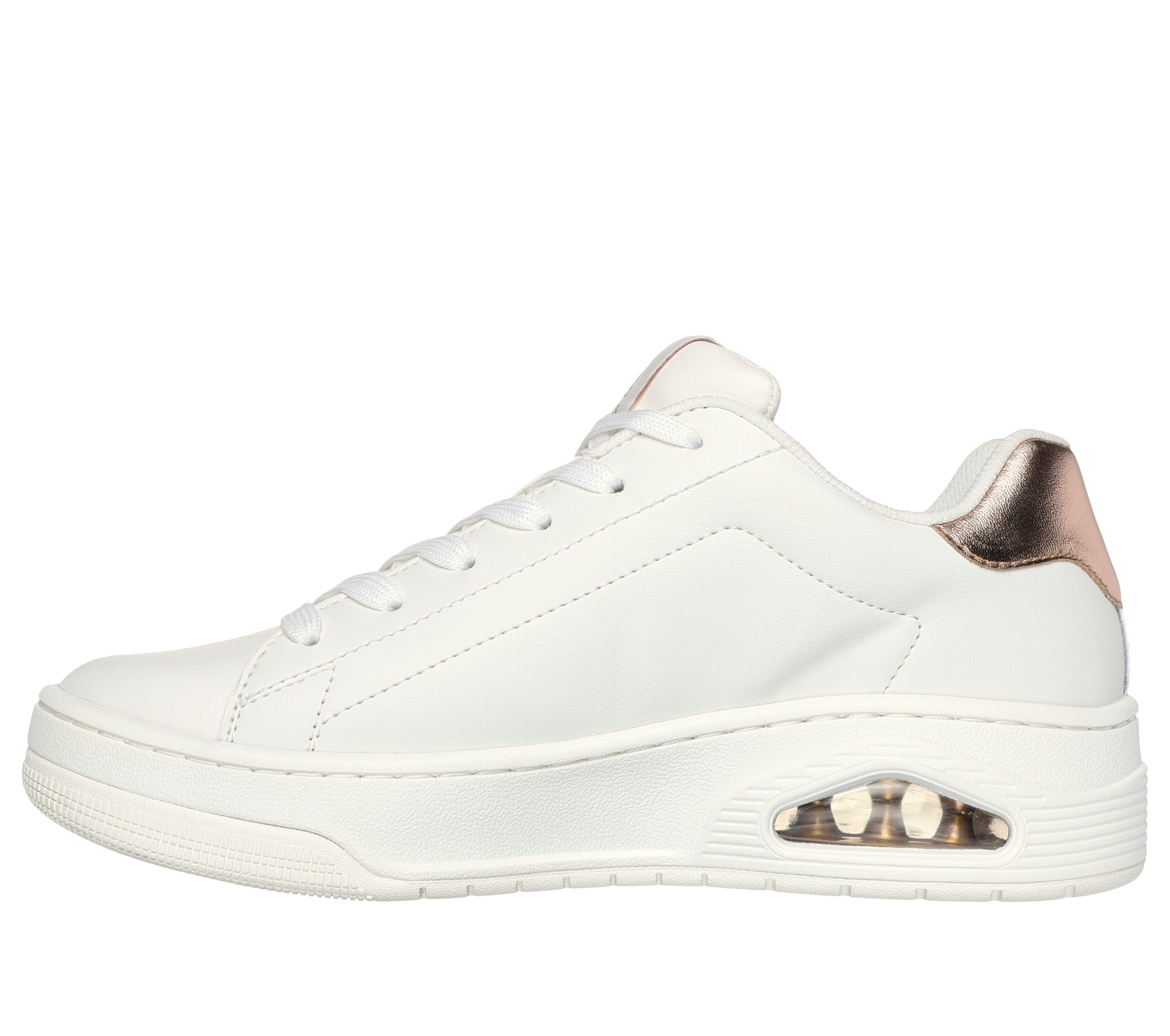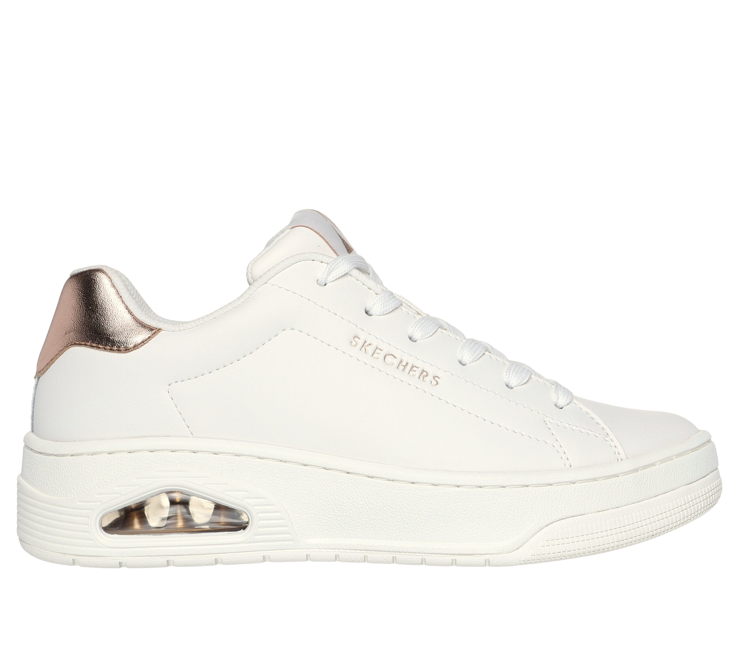 Skechers – Uno Court – Courted Air – kävelykengät ovat Uno-klassikkomalleista hieman matalavartisemmat, tyylikkäät ja rennot kengät. Kengissä on synteettinen duranahkapäällinen metallisilla yksityiskohdilla, Skechers Air-Cooled Memory Foam -sisäpohja ja näkyvä Skech-Air ilmatyyny välipohjassa. Nauhojen avulla saa säädettyä tiukkuuden sopivaksi.